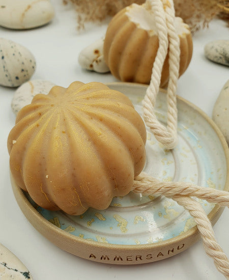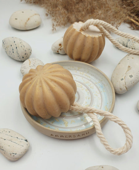 Mit der praktischen Baumwoll-Kordel kann diese Seife überall aufgehängt werden und darf in keiner Dusche fehlen.